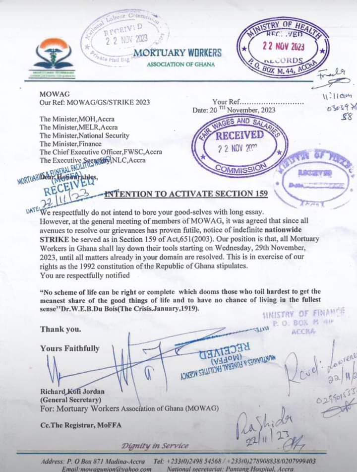 The Mortuary Workers Association of Ghana (MOWAG), has notified six government institutions of their intent to embark on a nationwide strike starting November 29, 2023.