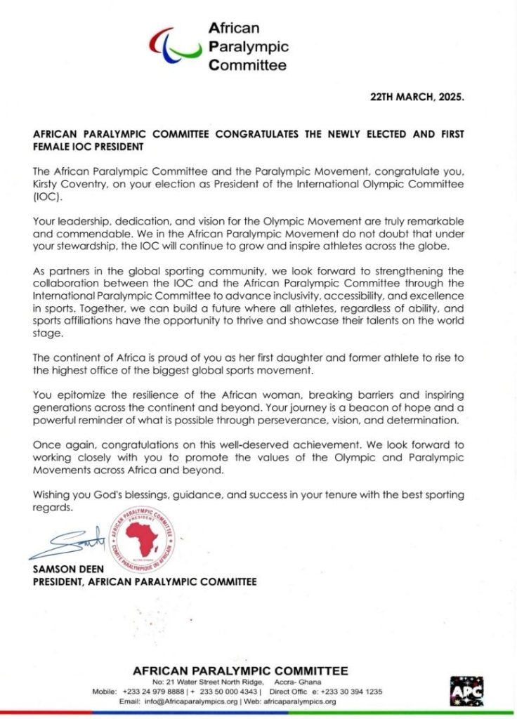 Coventry’s election is a significant milestone for Africa and the global sporting community. She has broken barriers and inspired generations of athletes and her journey serves as a powerful reminder of what can be achieved through hard work and determination. The African Paralympic Committee wishes Coventry all the best in her tenure as IOC President and looks forward to a fruitful collaboration.