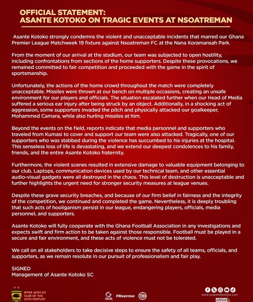 Asante Kotoko has issued a strong condemnation of the escalating violence in Ghana Premier League after the tragic death of one of its supporters, identified as Francis Yaw Frimpong (Nana Pooley). The devoted fan succumbed to injuries sustained during a violent altercation that erupted following Kotoko’s Ghana Premier League match against Nsoatreman FC on Sunday, February, 2nd, 2025. According to the club’s official statement, media personnel and supporters who traveled from Kumasi to cheer on the team were attacked after the match at Nana Konamansah Park.