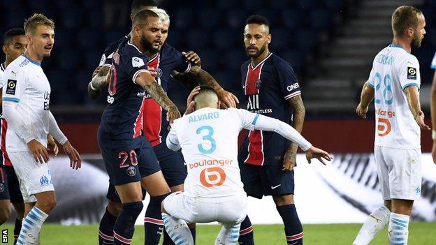 Home substitutes Leandro Paredes and Layvin Kurzawa, and Marseille’s Jordan Amavi and Dario Benedetto were dismissed along with Neymar.
