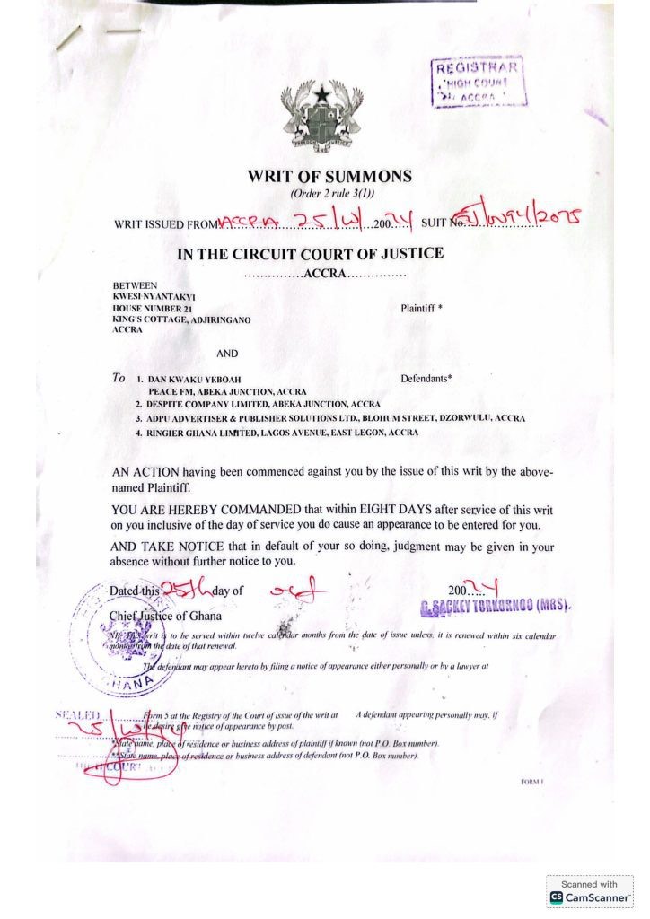 Former Ghana Football Association (GFA) President Kwesi Nyantakyi has launched a defamation lawsuit against Dan Kweku Yeboah and his media outlet, Peace FM.