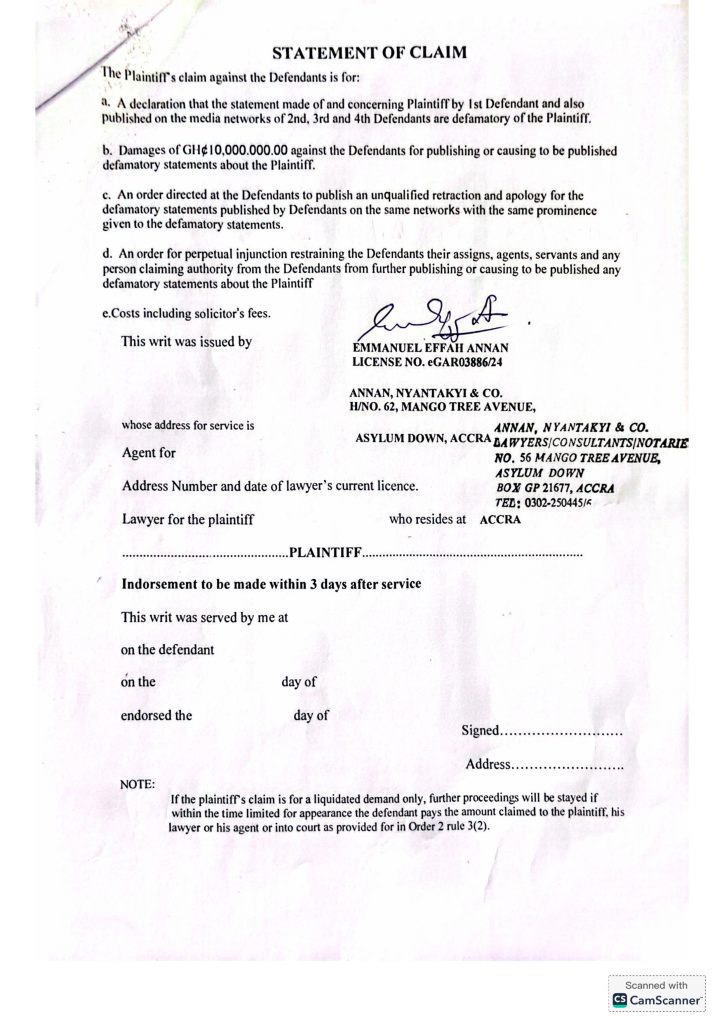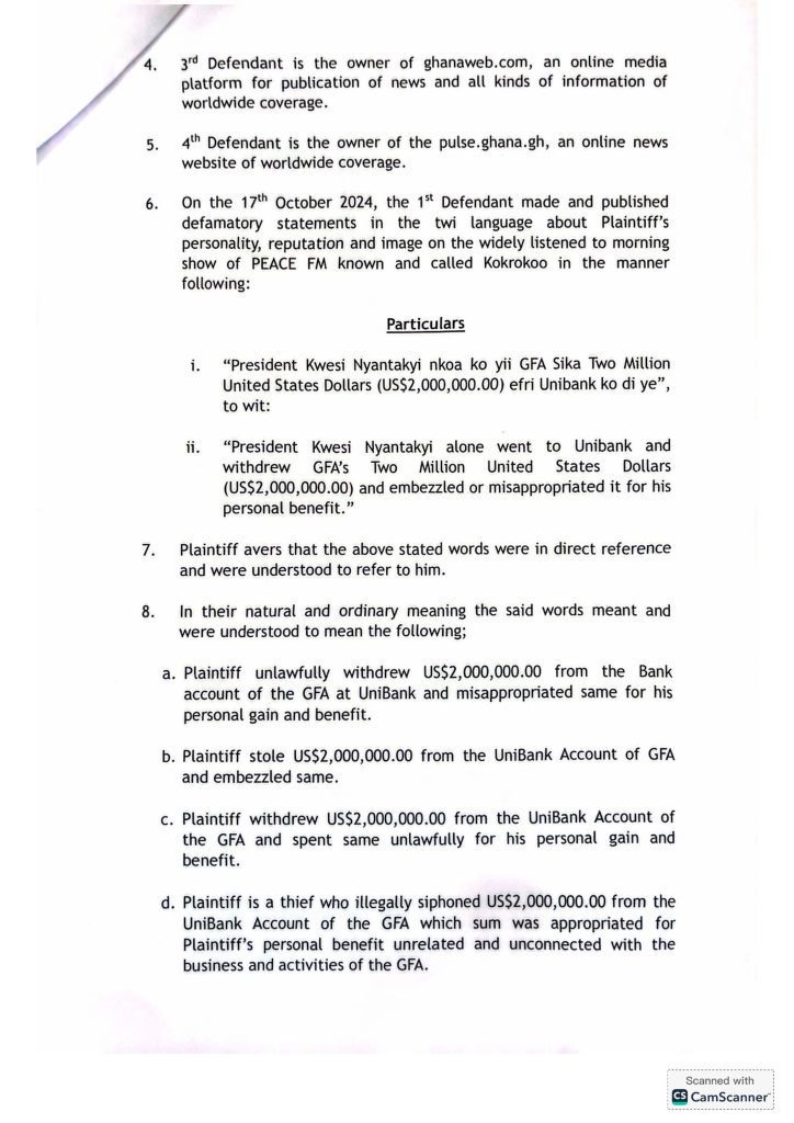 The legal document filed by Nyantakyi outlines the defamatory nature of the remarks made by Yeboah and the involved media outlets. It highlights a specific accusation that Nyantakyi personally withdrew $2 million from GFA’s accounts at Unibank for personal use. Nyantakyi vehemently denies these claims, emphasizing that they have no grounding in reality and have unjustly damaged his reputation.