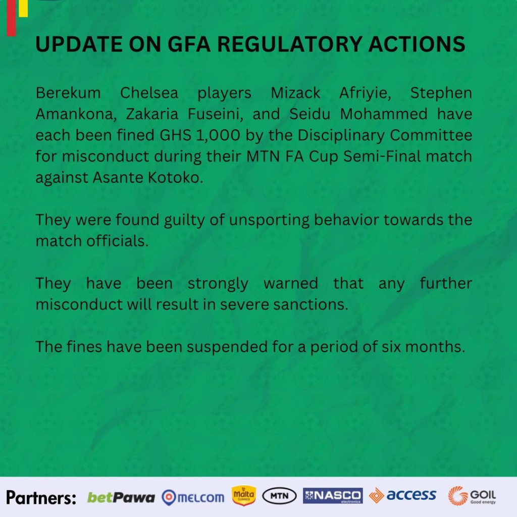 The Ghana Football Association‘s (GFA) Disciplinary Committee has taken a firm stance against misconduct in the MTN FA Cup, sanctioning Berekum Chelsea head coach Samuel Boadu and four of his players GHS 1,000 for their behavior towards match officials during the semi-final match against Asante Kotoko.