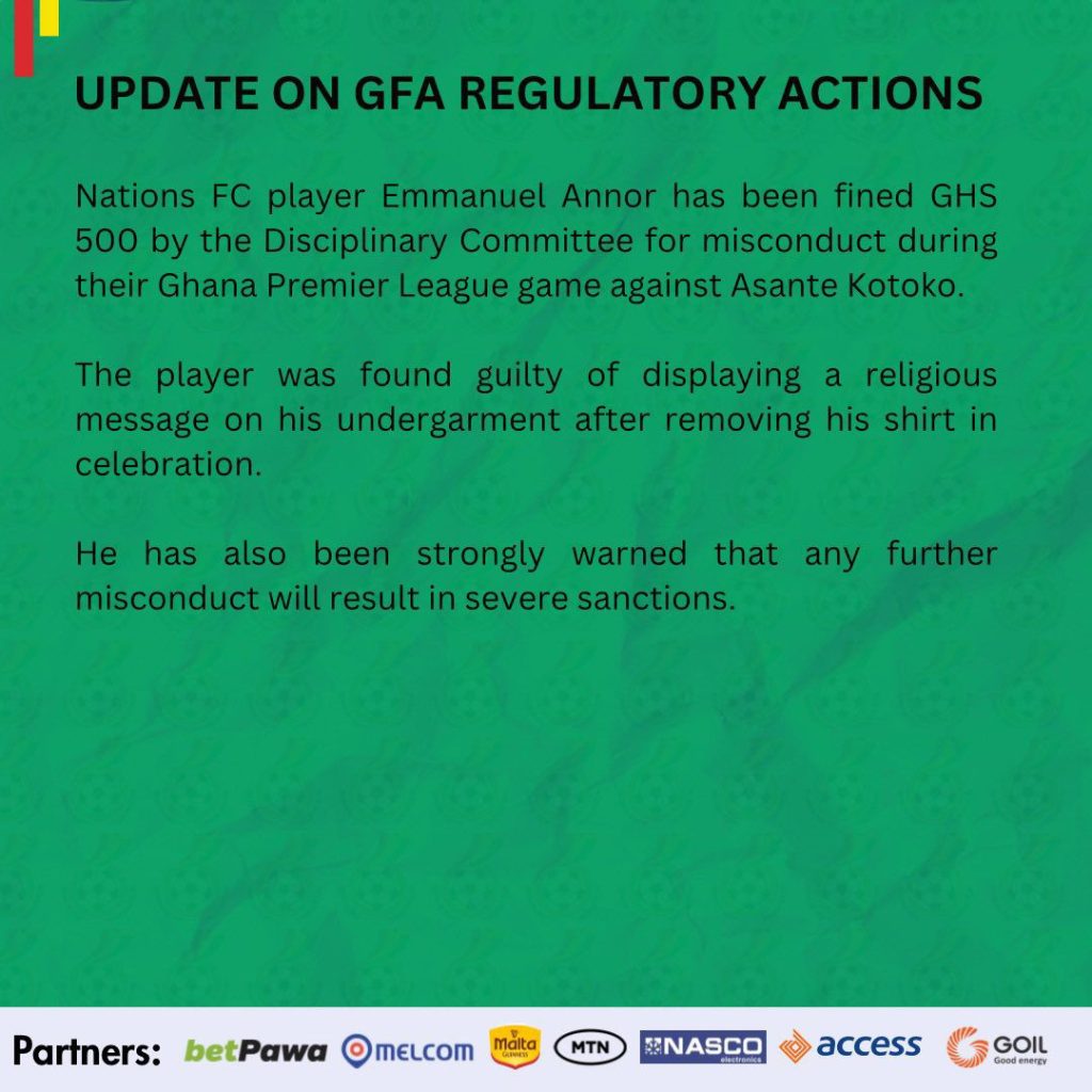 The Ghana Football Association (GFA) has taken disciplinary action against Nations FC player Emmanuel Annor following a controversial celebration during a recent league match. Annor was fined GHS 500 after scoring a goal against Asante Kotoko and removing his shirt to reveal a religious message on his undergarment which reads, ‘I belong to Jesus.’