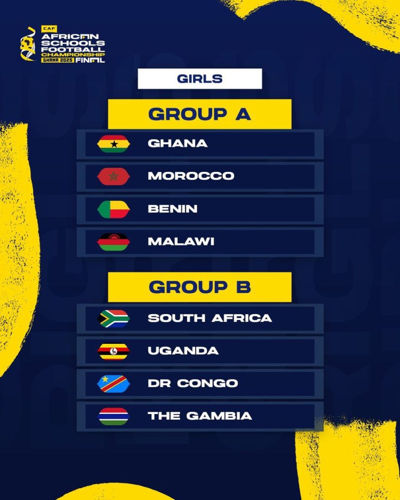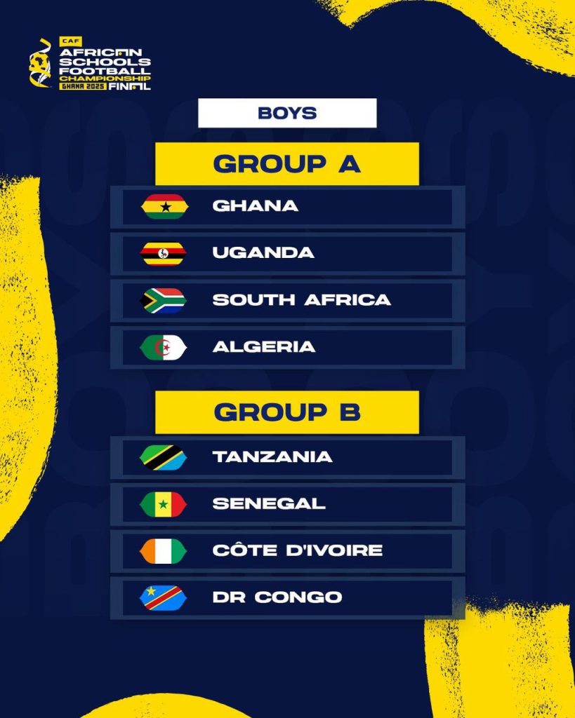 Ghana’s national schools football teams are set to compete in the upcoming 2025 CAF African Schools Football Championship Finals, scheduled to take place in Accra, Ghana. Both the boys and girls teams have been placed in Group A. The championship is scheduled to run from Wednesday, April 23, 2025, to Saturday, April 26, 2025.