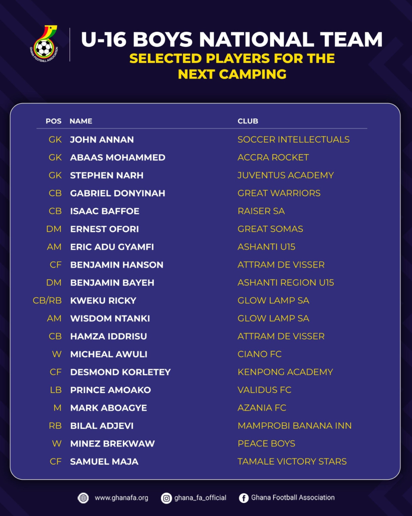 The squad will assemble at the Ghanaman Soccer Centre of Excellence in Prampram on May 6, 2025, to begin intensive training ahead of the prestigious Guadeloupe U-16 Invitational Tournament. The initiative reflects Ghana’s commitment to nurturing young talent and providing a global platform for players to showcase their skills.