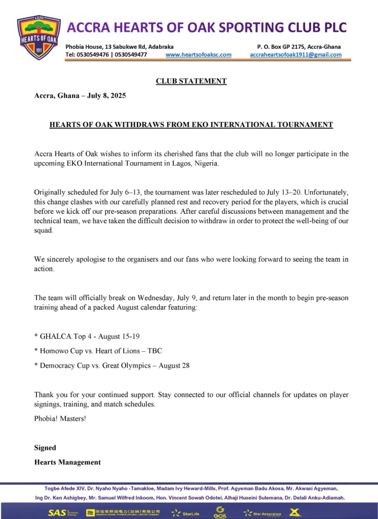 Accra Hearts of Oak has announced its withdrawal from the upcoming EKO International Tournament in Lagos, Nigeria, citing the need to prioritize player rest and recovery. The tournament, initially set for July 6-13, was postponed to July 13-20, a schedule that conflicts with the club’s carefully planned off-season regimen.