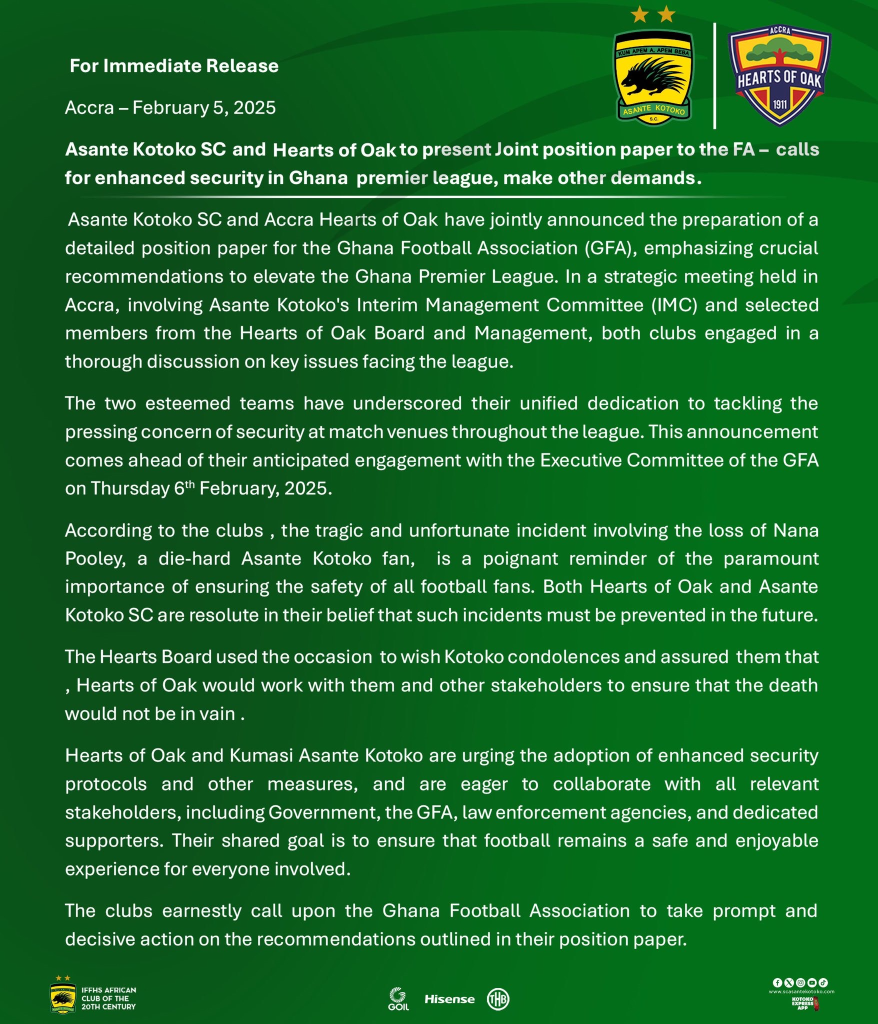 Asante Kotoko SC and Accra Hearts of Oak, in a move to address pressing issues within the Ghana Premier League, have announced their collaboration on a comprehensive position paper aimed at the Ghana Football Association (GFA).