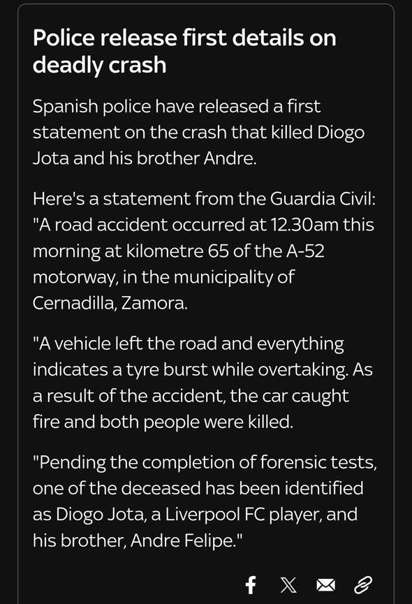Spanish police have confirmed that Liverpool forward Diogo Jota and his brother, André Silva, died in a car accident near Zamora in northwestern Spain early on July 3, 2025. According to the Guardia Civil, the brothers’ Lamborghini left the road on the A-52 motorway near Cernadilla after what is believed to have been a tyre burst while overtaking. The vehicle caught fire, killing both men instantly. Firefighters were called to contain the blaze, which spread to nearby vegetation, but the occupants could not be saved.