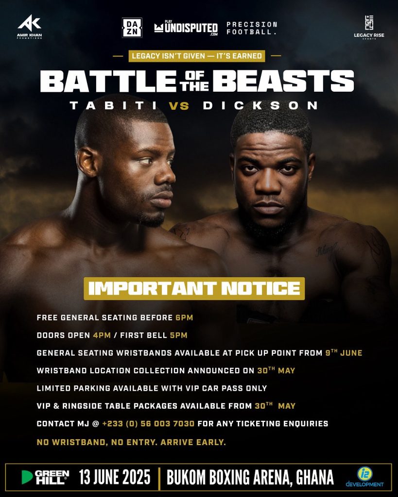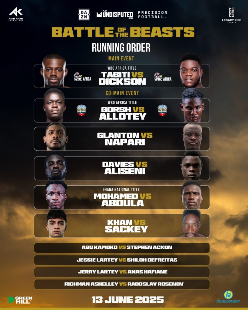 - Headline clash: Ghana’s own Jacob “The Beast” Dickson will face off against American Andrew Tabiti, with the WBC Africa Bridgerweight title on the line.