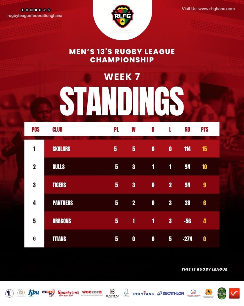 Despite Bulls’ efforts, including tries from Desmond Geotrah and Martin Buabeng, Skolars held on to secure a 22–14 win, finishing Round 1 unbeaten and topping the standings with 15 points. Meanwhile, the Nungua Tigers asserted their dominance with a convincing 36–4 win over Dragons RLC. From the outset, the Tigers controlled the game, racking up early tries and maintaining pressure throughout.