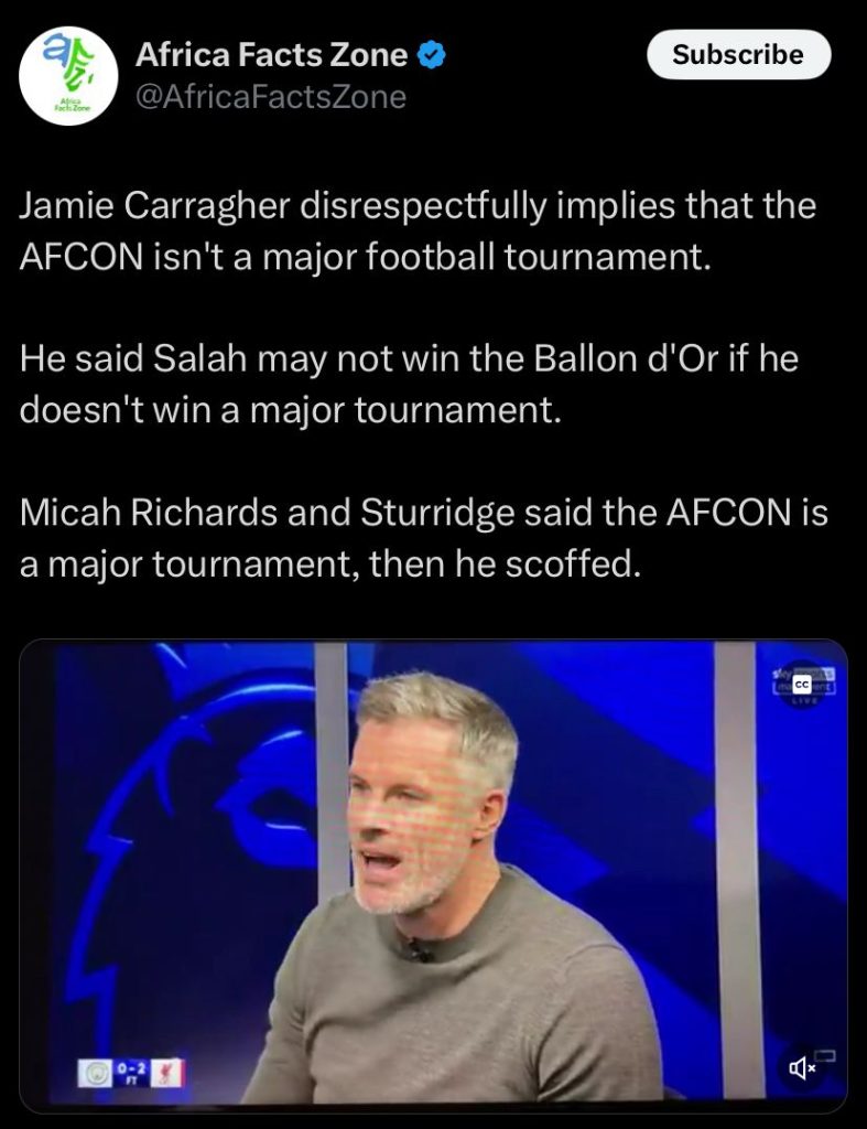 Former England defender Jamie Carragher sparked a wave of outrage on Monday, February 24, 2025, after making a provocative comment regarding the Africa Cup of Nations (AFCON). Carragher criticized the tournament, suggesting that its perceived lack of prestige indirectly hinders Mohamed Salah’s chances of winning individual accolades like the Ballon d’Or.