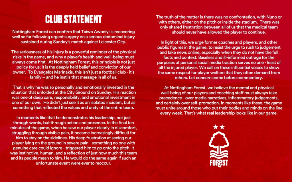 Nottingham Forest striker Taiwo Awoniyi has been placed in an induced coma following urgent surgery for a severe abdominal injury sustained during Sunday’s 2-2 draw with Leicester City. The 27-year-old collided with the goalpost in the final moments of the match, prompting immediate medical attention.