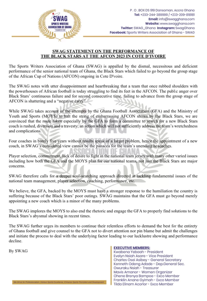 The Sports Writers Association of Ghana (SWAG) has called on the Ghana Football Association (GFA) and the Ministry of Youth and Sports (MOYS) for a deep soul-search approach to handling matters of national teams in the wake of an abysmal performance in the ongoing 2023 African Cup of Nations (AFCON) in Ivory Coast.