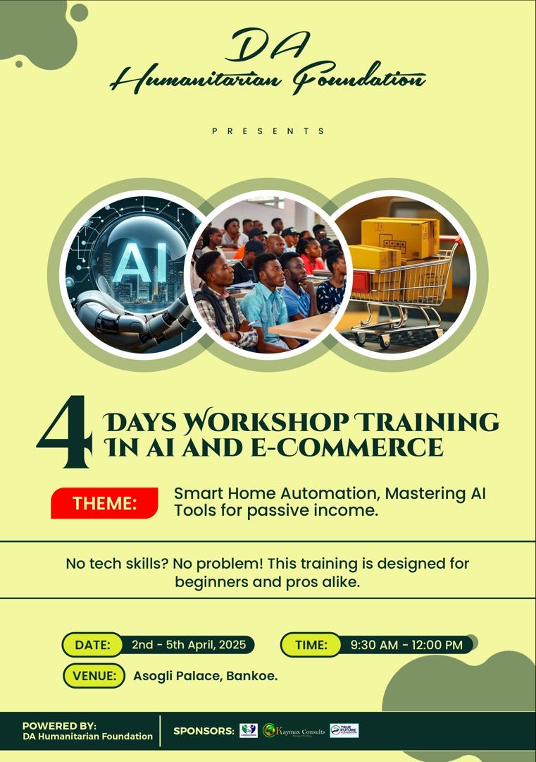 As part of efforts to enhance the skills and knowledge of young people in the Ho Municipality, the Asogli State in collaboration with DA Humanitarian Foundation will hold a free 4-day workshop in Artificial Intelligence (AI) and E-commerce from 2 to 5 April 2025.