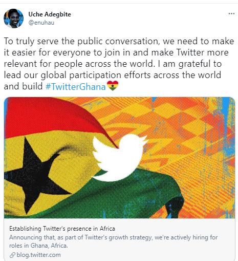 Full details on current job openings can be found on the Twitter Careers site. Aligned with our existing WFH policies, we look forward to welcoming and onboarding our new team members remotely so that we can make an immediate impact while we explore the opportunity to open an office in Ghana in the future.