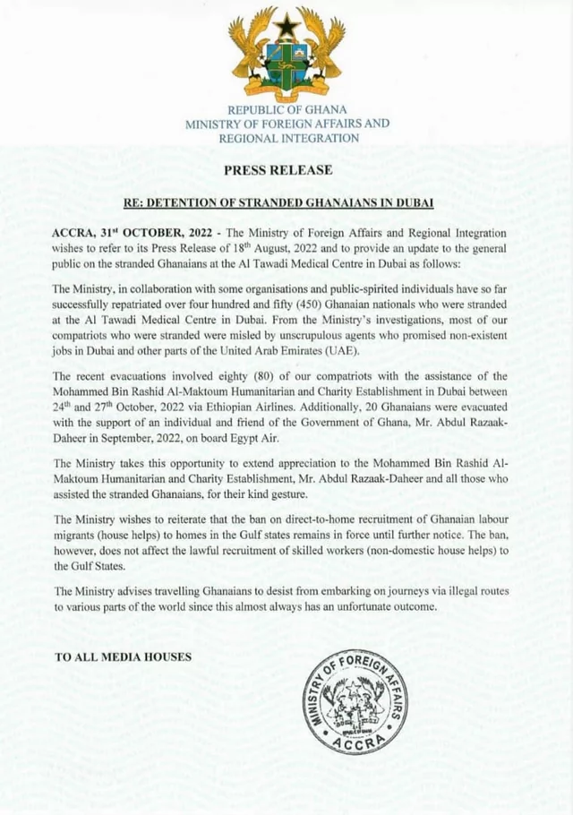 The Ministry, said it has not received any communications from UAE suggesting that Ghanaians have been banned from entering Dubai or any other part of UAE. It however said the UAE has reviewed its tourist visit visa.
