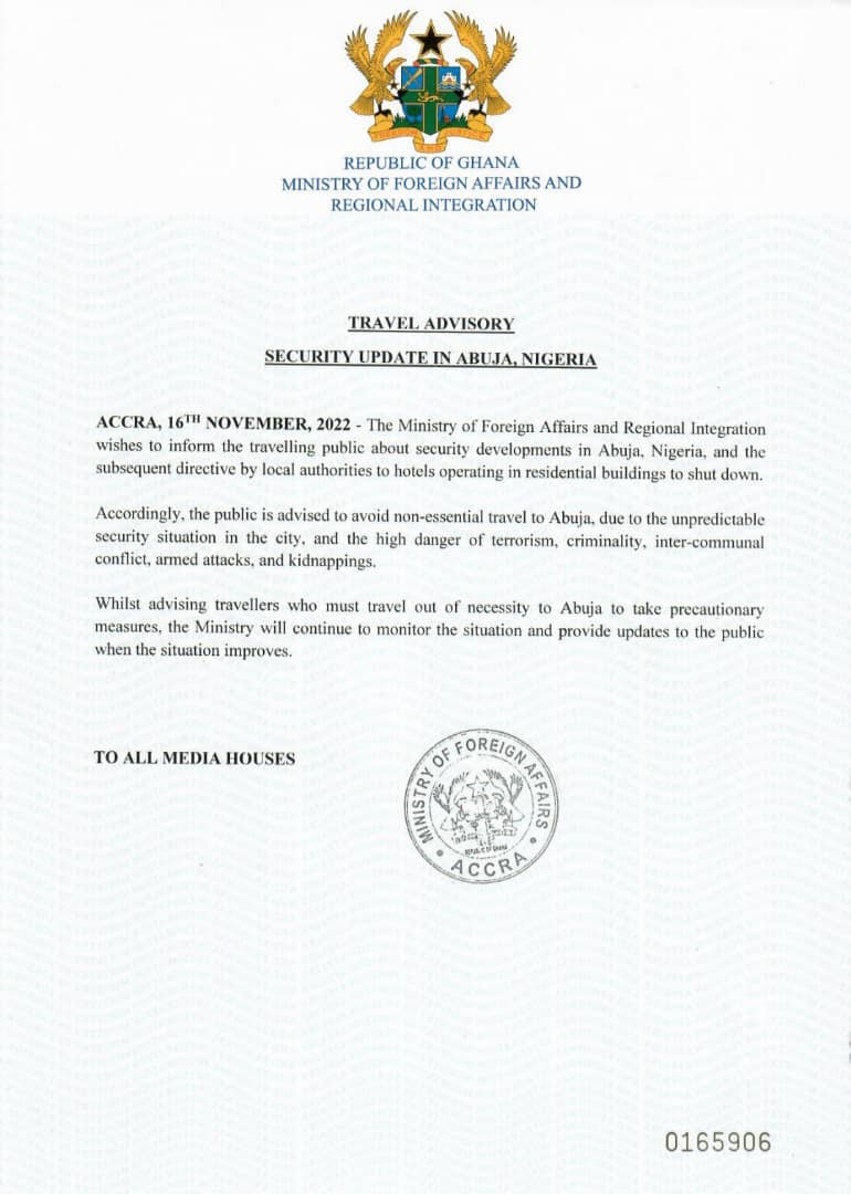 “The Ministry wishes to inform the travelling public about security developments in Abuja, Nigeria and the subsequent directive by local authorities to hotels operating in residential buildings to shut down”. the statement added