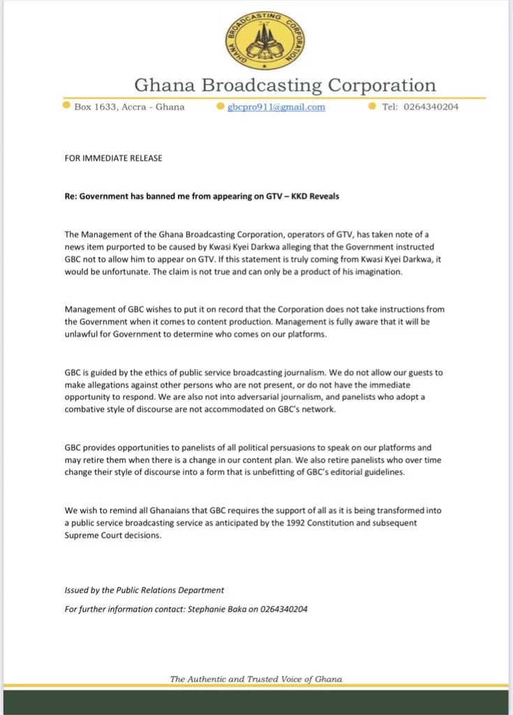Management of the Ghana Broadcasting Corporation has taken note of a news item purported to be caused by Kwasi Kyei Darkwah alleging that the Government instructed GBC not to allow him to appear on GTV.