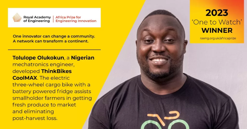 In addition to the Africa Prize, the remaining 11 innovators from the 2023 shortlist competed for the One to Watch Prize. They presented their innovations to a live audience who voted for the pitch that showed the most potential for impact. Tolulope Olukokun was selected as the winner of the Africa Prize’s One-to-Watch Award of £5,000. This Award recognises the potential of Olukokun innovation, an electric cargo bike with a battery powered fridge to help Nigeria’s smallholder farmers get fresh food crops to market. The profiles and pitch decks of the 15 engineers comprising the 2023 cohort can be viewed here.